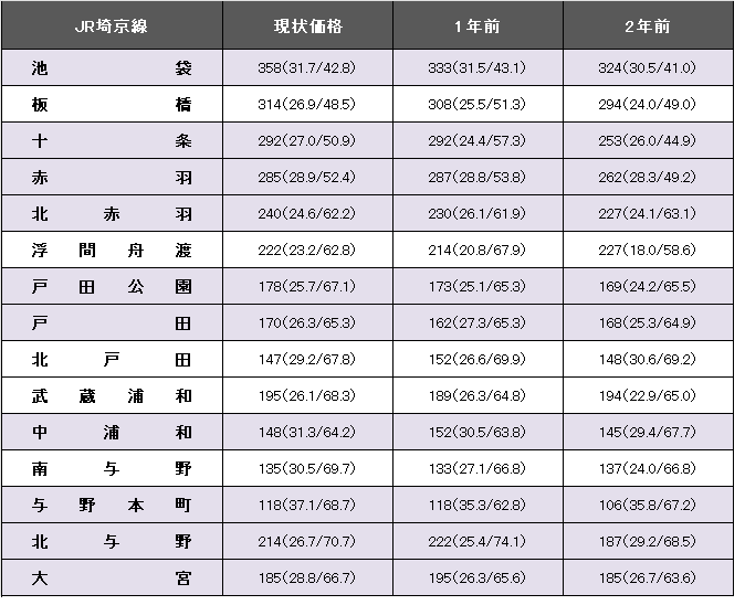 JR埼京線(池袋~大宮)の平均坪単価は218万円で、1年前に比べて4万円、1.8%下落した。事例数は3525件(前年より113件減)、平均築年数は28.5年(1年前27.4年)、平均専有面積は61.63平方メートル(同60.41平方メートル)だった。掲載区間の最高値は池袋の358万円。