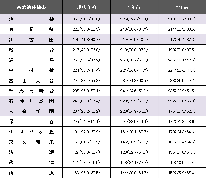 西武池袋線(池袋~飯能)における平均坪単価は202万円で、1年前に比べて2万円下落した。事例数は3882件(前年より109件減)、平均築年数は31.3年(1年前31.2年)、平均専有面積は57.23平方メートル(同55.05平方メートル)だった。今回掲載区間(池袋~所沢)における最高値は池袋の365万円。