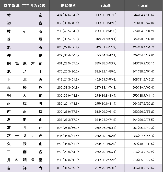 京王井の頭線(渋谷~吉祥寺)における平均坪単価は403万円で、1年前に比べて33万円、8.9%上昇した。事例数は2002件(前年より124件減)、平均築年数は31.1年(1年前30.7年)、平均専有面積は57.08平方メートル(同55.10平方メートル)だった。最高値は渋谷の626万円。