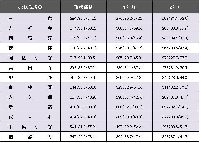 JR総武線(三鷹~千葉)の平均坪単価は255万円で、1年前から0.7%、2万円下落した。事例数は9721件(前年より1214件減)、平均築年数が32.0年(1年前30.4年)、平均専有面積は58.42平方メートル(同57.15平方メートル)。今回掲載区間(三鷹~信濃町)の最高値は、千駄ケ谷の504万円。