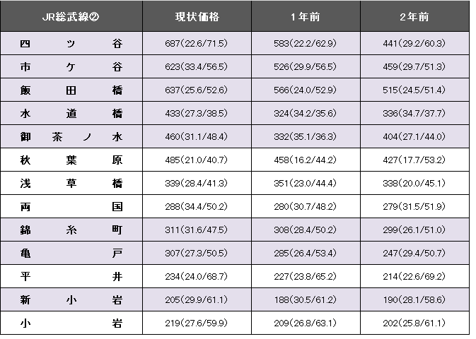 JR総武線(三鷹~千葉)の平均坪単価は255万円で、1年前から0.7%、2万円下落した。事例数は9721件(前年より1214件減)、平均築年数が32.0年(1年前30.4年)、平均専有面積は58.42平方メートル(同57.15平方メートル)。今回掲載区間(四ツ谷~小岩)の最高値は、四ツ谷の687万円。