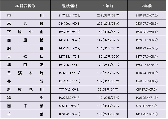JR総武線(三鷹~千葉)の平均坪単価は255万円で、1年前から0.7%、2万円下落した。事例数は9721件(前年より1214件減)、平均築年数が32.0年(1年前30.4年)、平均専有面積は58.42平方メートル(同57.15平方メートル)。今回掲載区間(市川~千葉)の最高値は、本八幡の244万円。