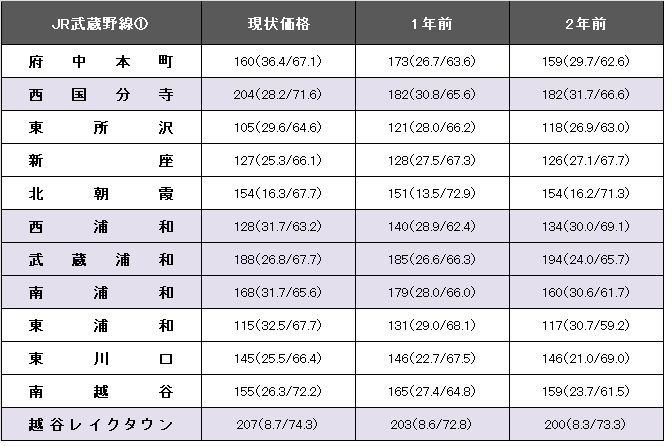 JR武蔵野線(府中本町~西船橋)の平均坪単価は145万円で、1年前から3.5%、5万円下落した。事例数は3079件(前年より90件減)、平均築年数が29.9年(1年前28.1年)、平均専有面積は68.96平方メートル(同69.10平方メートル)。今回掲載区間(府中本町~越谷レイクタウン)の最高値は、越谷レイクタウンの207万円。