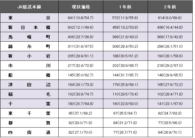 JR総武本線(東京~四街道)の平均坪単価は179万円で、1年前から2.9%、5万円下落した。事例数は3561件(前年より166件減)、平均築年数は30.9年(1年前29.3年)、平均専有面積は65.22平方メートル(同63.94平方メートル)。同区間の最高値は、東京の641万円。