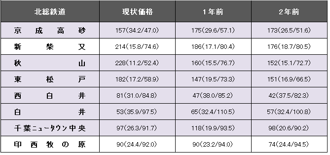 北総鉄道(京成高砂~印西牧の原)の平均坪単価は116万円で、1年前から6.3%、8万円下落した。事例数は607件(前年より88件増)、平均築年数は26.6年(1年前25.1年)、平均専有面積は80.26平方メートル(同82.62平方メートル)。同区間の最高値は秋山の228万円。