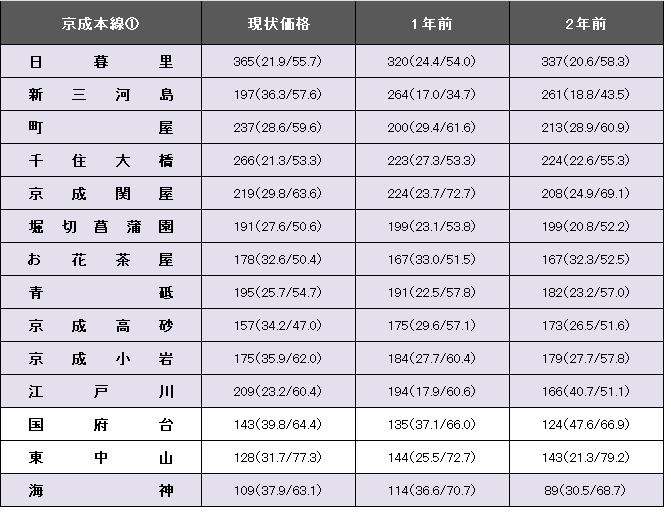 京成本線(日暮里~京成成田)の平均坪単価は153万円で、1年前に比べて2.2%、3万円下落した。事例数は2577件(前年より10件減)、平均築年数が31.7年(1年前30.9年)、平均専有面積は63.61平方メートル(同63.43平方メートル)。今回掲載区間(日暮里~海神)の最高値は日暮里の365万円。