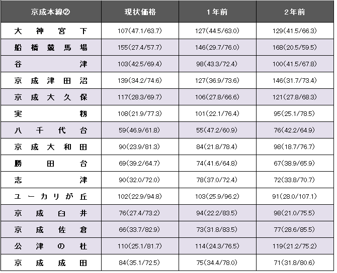 京成本線(日暮里~京成成田)の平均坪単価は153万円で、1年前に比べて2.2%、3万円下落した。事例数は2557件(前年より10件減)、平均築年数が31.7年(1年前30.9年)、平均専有面積は63.61平方メートル(同63.43平方メートル)。今回掲載区間(大神宮下~京成成田)の最高値は船橋競馬場の155万円。同駅は今期の事例数が20件未満で変動幅が大きくなっている。