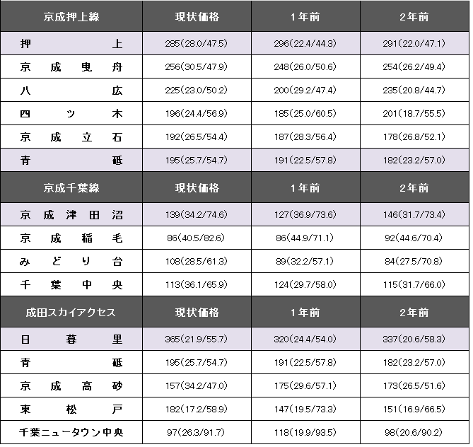 成田スカイアクセス(日暮里~千葉ニュータウン中央)の平均坪単価は198万円。1年前に比べて5.6%下落した。事例数は674件(前年より31件減)、平均築年数が25.2年(1年前23.7年)、平均専有面積は64.69平方メートル(同64.85平方メートル)だった。同区間における最高値は日暮里の365万円だった。