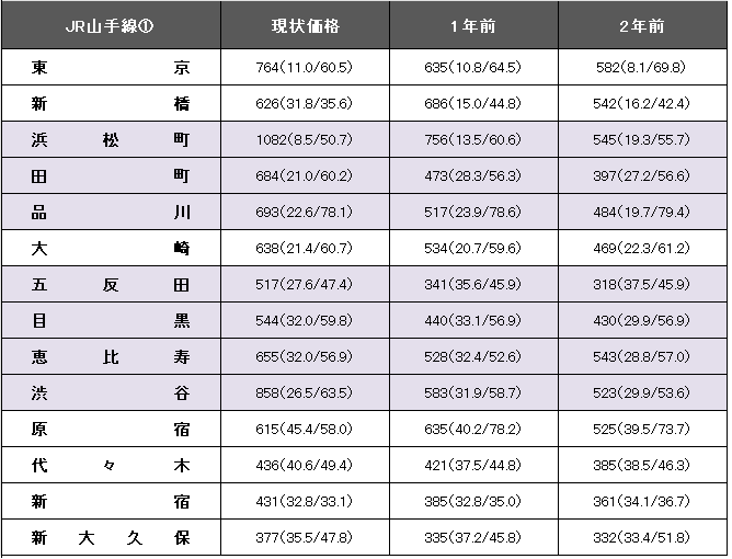 事例数が豊富な田町~渋谷も前期からの大幅上昇が目立つ。田町、品川は600万円台後半、五反田、目黒も500万円台に乗った。恵比寿は24%台の上昇に転じ、坪655万円となった。
