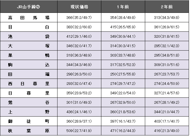JR山手線(品川~田端~東京~品川と回る環状線)の平均坪単価は538万円。1年前に比べて113万円、26.7%上昇した。事例数は6321件(前年よりも846件減)、平均築年数が28.3年(1年前は29.7年)、平均専有面積は54.12平方メートル(同53.43平方メートル)。今回掲載区間(高田馬場~秋葉原)の最高値は秋葉原の509万円。