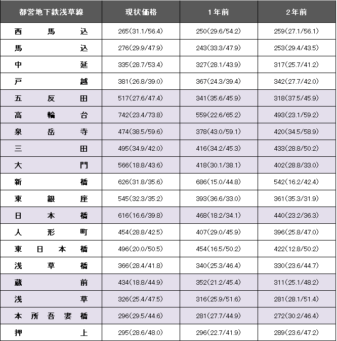 都営地下鉄浅草線(西馬込~押上)における平均坪単価は422万円。1年前に比べて71万円、20.5%上昇した。事例数は2416件(前年より556件減)、平均築年数は28.0年(1年前28.9年)、平均専有面積は48.72平方メートル(同48.32平方メートル)だった。掲載区間の最高値は高輪台の742万円。