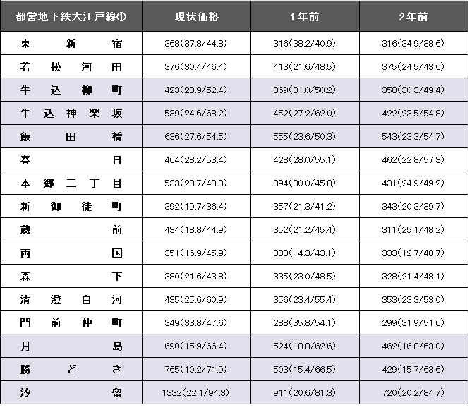 都営地下鉄大江戸線(東新宿~光が丘)における平均坪単価は615万円。1年前に比べて178万円、40.7%上昇した。事例数は6297件(前年より205件減)、平均築年数が24.1年(1年前27.5年)、平均専有面積は58.95平方メートル(同52.63平方メートル)だった。今回掲載駅(東新宿~汐留)における最高値は汐留の1332万円。