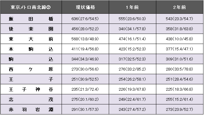 東京メトロ南北線(目黒~赤羽岩淵)の平均坪単価は655万円。1年前に比べて154万円、30.9%上昇した。事例数は3186件(前年よりも723件減)、平均築年数が26.7年(1年前は26.9年)、平均専有面積は60.55平方メートル(同59.13平方メートル)だった。今回掲載区間(飯田橋~赤羽岩淵)の最高値は飯田橋の636万円。