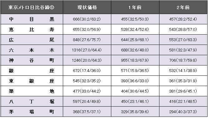 東京メトロ日比谷線(中目黒~北千住)の平均坪単価は613万円で1年前に比べて173万円、39.1%上昇した。事例数は3668件(前年より483件減)、平均築年数が26.9年(1年前27.0年)、平均専有面積は56.66平方メートル(同52.77平方メートル)。掲載区間(中目黒~茅場町)の最高値は六本木の1316万円。