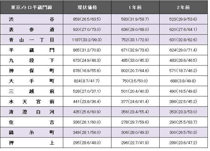 東京メトロ半蔵門線(渋谷~押上)における平均坪単価は655万円で1年前に比べて172万円、35.6%上昇した。事例数は1930件(前年より549件減)、平均築年数が27.1年(1年前28.4年)、平均専有面積は61.13平方メートル(同56.84平方メートル)。最高値は青山一丁目の1187万円。