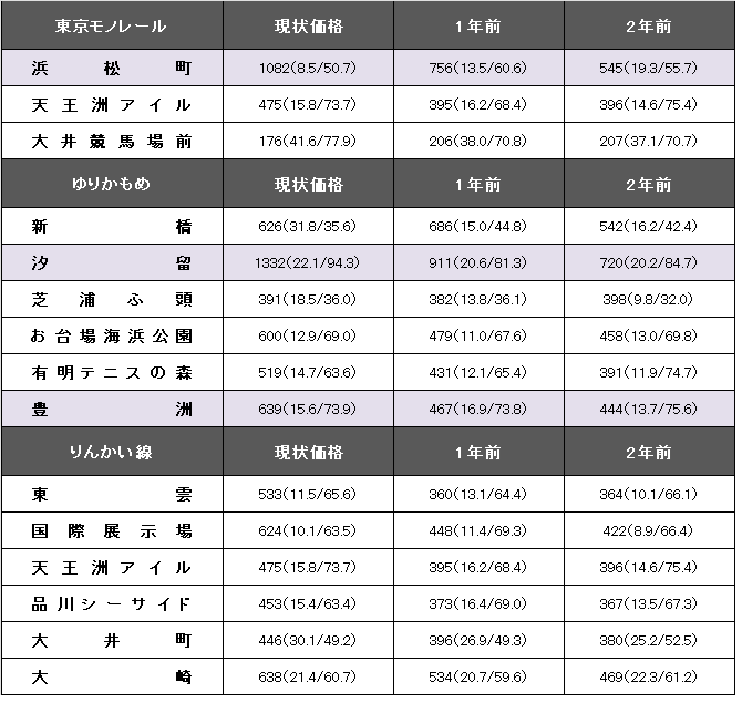 ゆりかもめ(新橋~豊洲)の平均坪単価は677万円で1年前から179万円上昇。事例数が1140件(前年より298件増)、平均築年数が16.5年(1年前15.8年)、平均専有面積は72.34平方メートル(同70.43平方メートル)。汐留、豊洲などが大幅上昇し、全体平均を大きく押し上げた。