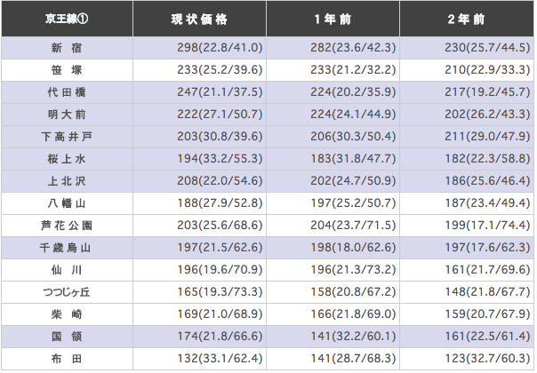 新宿から都心に近い上北沢までは上昇基調。明大前下高井戸はやや下げたが、2~3万円なので、ほぼ横ばい。