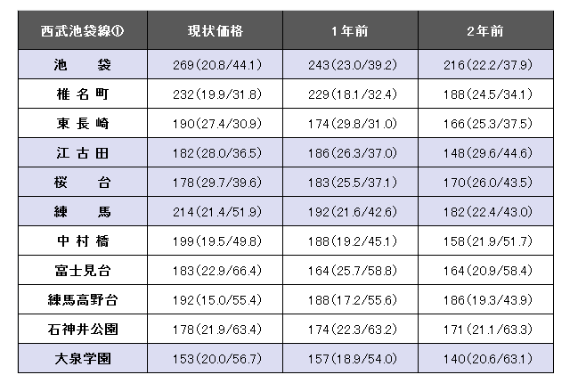 西武新池袋線(池袋~飯能)における坪(3.3平方メートル)当たりの平均価格は166万円。1年前に比べて9万円、5.9%上昇した。事例数は3088件(前年より366件減)、平均築年数が21.8年(1年前22.3年)、平均専有面積は56.16平方メートル(同53.82平方メートル)だった。掲載駅における最高値は池袋の269万円。