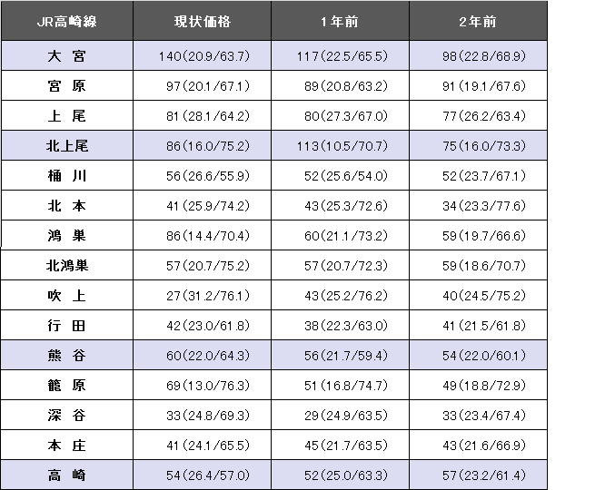 JR高崎線(大宮~高崎)における坪(3.3平方メートル)当たりの平均価格は87万円。1年前に比べて14万円、20.2%上昇した。事例数は1310件(前年より235件減)、平均築年数が22.7年(1年前22.8年)、平均専有面積は64.72平方メートル(同64.84平方メートル)だった。掲載駅における最高値は大宮の140万円。