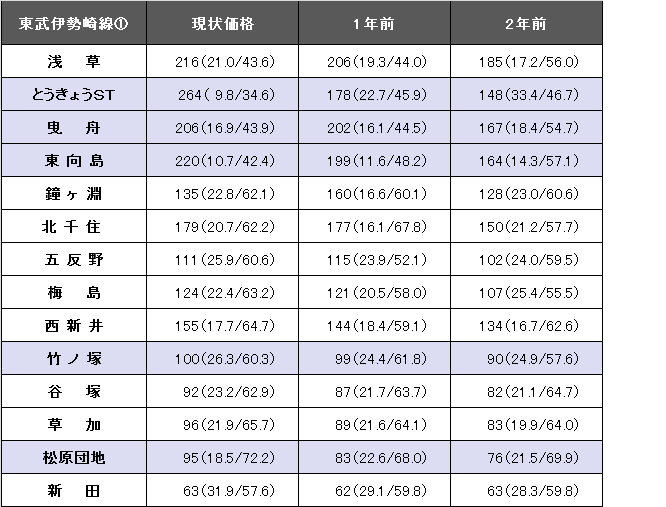 東武伊勢崎線(浅草~伊勢崎)における坪(3.3平方メートル)当たりの平均価格は124万円。1年前に比べて15万円、14.0%上昇した。事例数は2758件(前年より380件減)、平均築年数が21.8年(1年前21.8年)、平均専有面積は61.24平方メートル(同61.91平方メートル)だった。掲載駅における最高値はとうきょうスカイツリーの264万円。