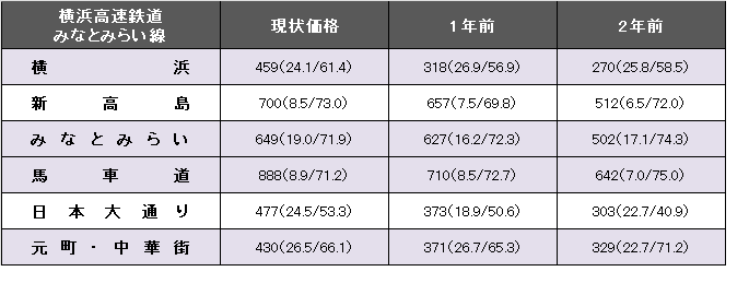 横浜高速鉄道みなとみらい線(横浜~元町・中華街)における平均坪単価は530万円で、1年前に比べて134万円、33.9%上昇。事例数は1373件(前年より282件増)、平均築年数は21.9年(1年前23.8年)、平均専有面積は64.32平方メートル(同61.03平方メートル)だった。最高値は馬車道の888万円。
