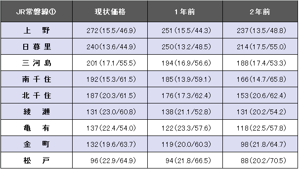 JR常磐線快速・各駅停車(上野~取手)における坪(3.3平方メートル)当たりの平均価格は126万円。1年前に比べて10万円、8.2%上昇した。事例数は2688件(前年より410件減)、平均築年数が22.5年(1年前22.0年)、平均専有面積は64.15平方メートル(同64.22平方メートル)だった。掲載駅における最高値は上野の272万円。
