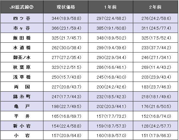 JR総武線(千葉~三鷹)における坪(3.3平方メートル)当たりの平均価格は198万円。1年前に比べて5万円、2.7%上昇した。事例数は6881件(前年より1337件減)、平均築年数が23.8年(1年前22.7年)、平均専有面積は56.63平方メートル(同54.84平方メートル)だった。掲載駅における最高値は市ヶ谷の366万円。