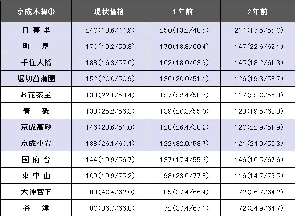 京成本線(京成上野~成田空港)における坪(3.3平方メートル)当たりの平均価格は119万円。1年前に比べて4.9%上昇した。事例数が1594件(前年より260件減)、平均築年数が23.5年(1年前23.3年)、平均専有面積は63.53平方メートル(同63.40平方メートル)だった。掲載駅における最高値は日暮里の240万円。