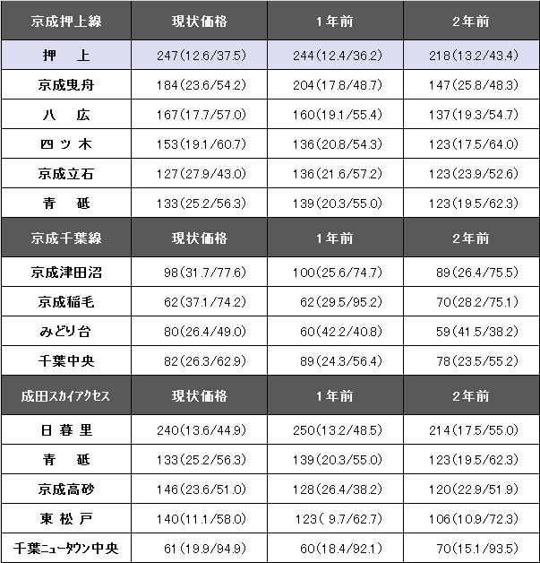 成田スカイアクセス(京成上野~成田空港)における坪当たりの平均価格は131万円。1年前に比べて1.4%上昇した。事例数が467件(前年より142件減)、平均築年数が19.1年(1年前18.1年)、平均専有面積は68.91平方メートル(同66.36平方メートル)だった。掲載駅における最高値は押上の247万円。