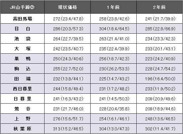 JR山手線(品川~田端~東京~品川と回る環状線)における坪(3.3平方メートル)当たりの平均価格は302万円。1年前に比べて5万円、1.8%上昇した。事例数は6079件(前年より622件減)、平均築年数が21.9年(1年前21.0年)、平均専有面積は52.49平方メートル(同52.69平方メートル)だった。今回掲載駅(高田馬場~秋葉原)における最高値は秋葉原の313万円。