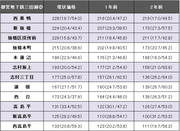 都営地下鉄三田線(目黒~西高島平)における坪(3.3平方メートル)当たりの平均価格は265万円。1年前に比べて10万円、3.7%上昇した。事例数は3895件(前年より33件減)、平均築年数が22.6年(1年前21.9年)、平均専有面積は51.59平方メートル(同51.55平方メートル)だった。今回掲載駅(西巣鴨~西高島平)における最高値は板橋区役所前の229万円。