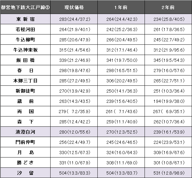 都営地下鉄大江戸線(光が丘~新宿<放射部>、新宿~都庁前<環状部>)における坪(3.3平方メートル)当たりの平均価格は316万円。1年前に比べて4万円、1.3%上昇した。事例数は6109件(前年より174件減)、平均築年数が19.1年(1年前18.6年)、平均専有面積は52.65平方メートル(同52.64平方メートル)だった。今回掲載駅(東新宿~汐留)における最高値は汐留の504万円。