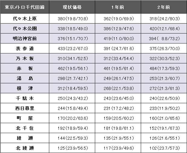 東京メトロ千代田線(代々木上原~北綾瀬)における坪(3.3平方メートル)当たりの平均価格は292万円。1年前に比べて0.7%、2万円下落した。事例数が2174件(前年より217件減)、平均築年数が21.6年(1年前22.4年)、平均専有面積は57.77㎡(同57.23㎡)だった。掲載駅における最高値は赤坂の462万円。
