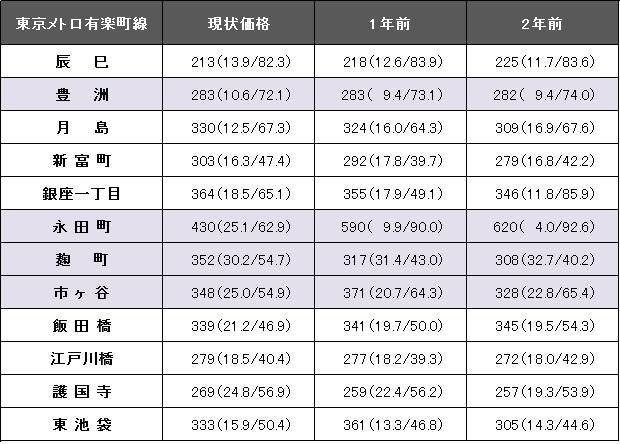 東京メトロ有楽町線(新木場~和光市)における坪(3.3平方メートル)当たりの平均価格は277万円。前年から横ばいだった。事例数が4076件(前年より107件減)、平均築年数が17.7年(1年前16.9年)、平均専有面積は58.21平方メートル(同57.65平方メートル)だった。掲載駅における最高値は永田町の430万円。なお池袋~和光市は次回の副都心線で掲載予定のため、省略。