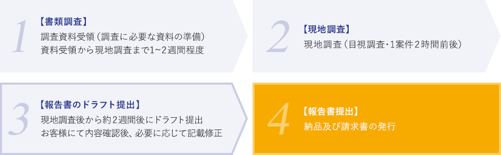 一般的には現地調査から2週間程度を初回のご報告とさせて頂いています。案件や内容により異なりますので、御見積もり依頼の際にご確認ください。