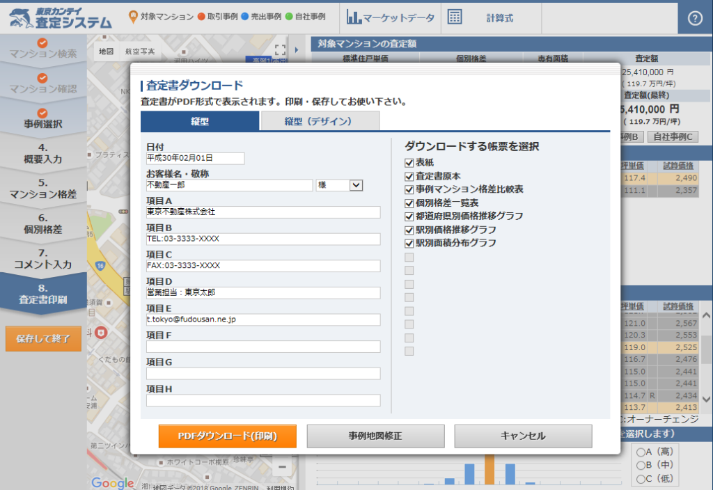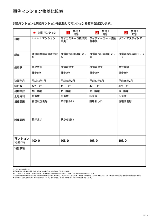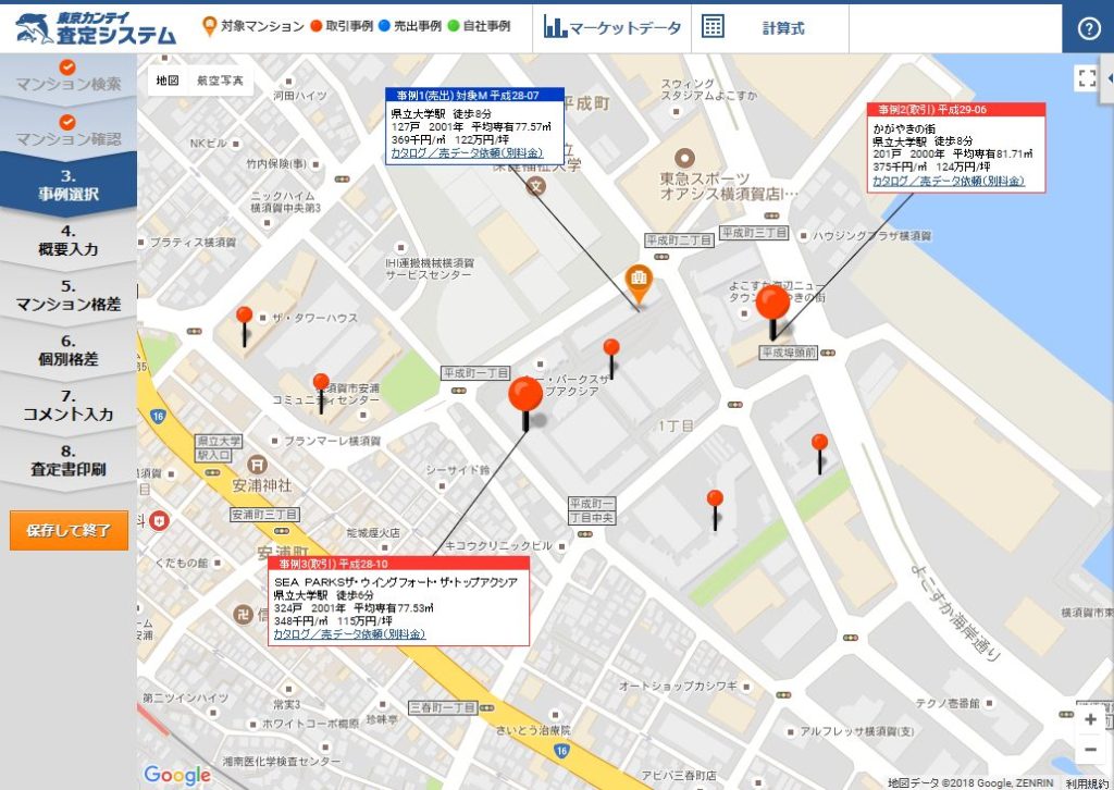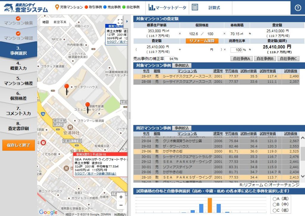 一般的な査定システムとは異なり、すでに公的価格や売買事例がシステム内に登録されています。マンションの査定なら東京カンテイのデータベースに連動し、物件概要の入力すら不要。圧倒的なスピードで査定書が作成できます。しかも説明の難しい統計的手法ではなく、「価格根拠の明示」が可能な売買事例での比準による手法を採用しています。