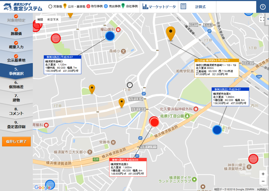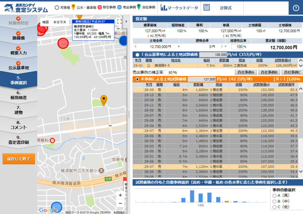 取引事例比較法を用いた不動産査定システムは、全国の不動産会社から圧倒的なご支持を頂いております。標準化補正した比較しやすい事例を用いる事で、査定価格を瞬時に算出出来ます。プロの皆様の相場感を、短時間で論理的に査定書としてまとめることが出来るシステムです。
