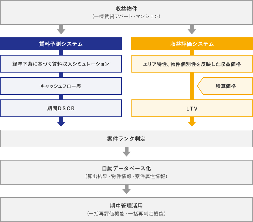 収益評価サービスは、国内最大級の賃料事例データベースと明確なシステムロジックに基づき、居住用収益物件(一棟賃貸アパート・マンション)の個々のポテンシャルを反映した収益力(リスク)を収益力を算定します。「賃料予測システム」で将来リスクを取り入れた返済能力を、「収益評価システム」で収益性を踏まえた保全力を算定し、入口審査における客観的な案件審査をサポートします。また、期中管理においても自動データベース化を活用した取組みが可能です。